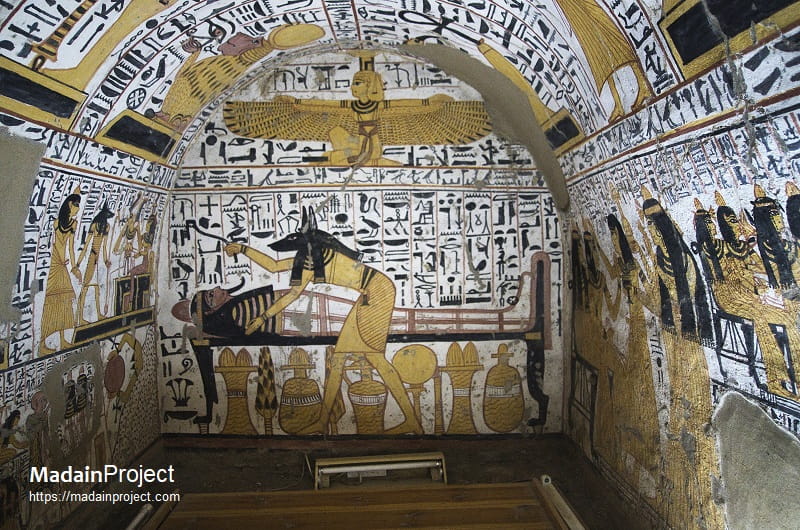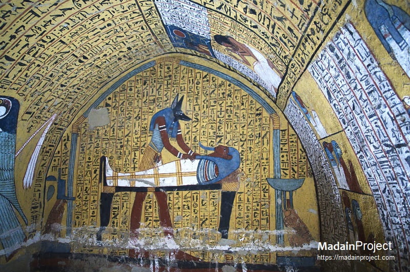 The Tomb of Pashedu, designated TT3 (Theban Tomb 3), located in the village of Deir el-Medina, is one of the few tombs with open access. The tomb layout is simple but beautifully decorated, indicating the high status of Pashedu in society. He also owned tomb TT326, again showing how wealthy he was. The tomb has an antechamber and a short corridor which ended in a burial chamber. The vaulted ceiling has eight deities on the right and eight on the left. Between these images are forty columns of text from Book of the Dead of chapter 181. There are a number of errors in terms of spelling, grammar and text present.